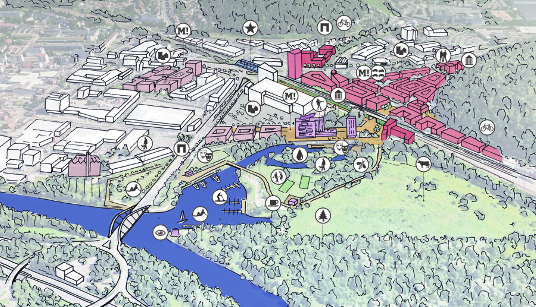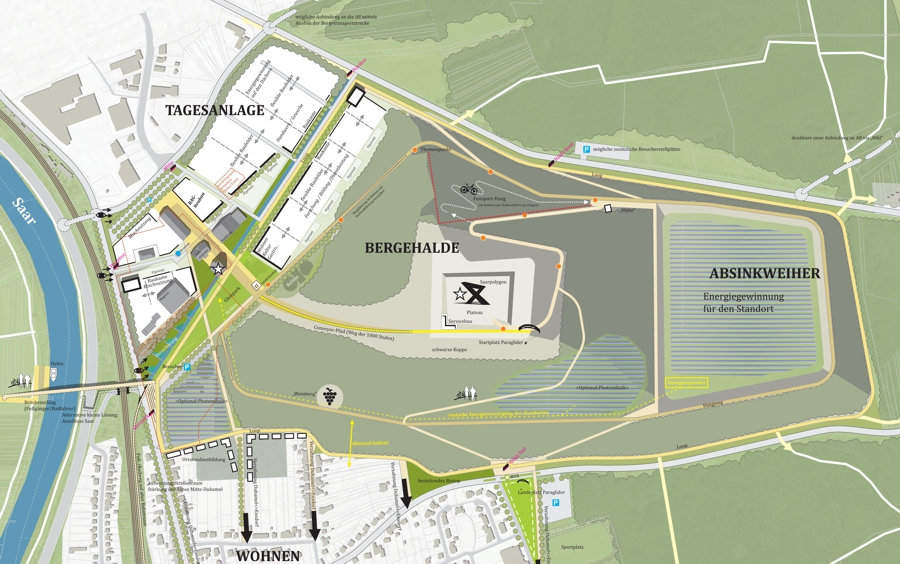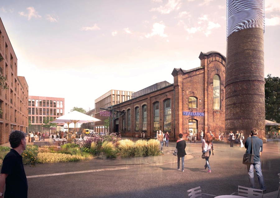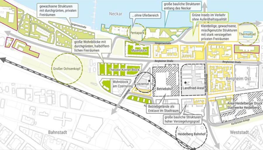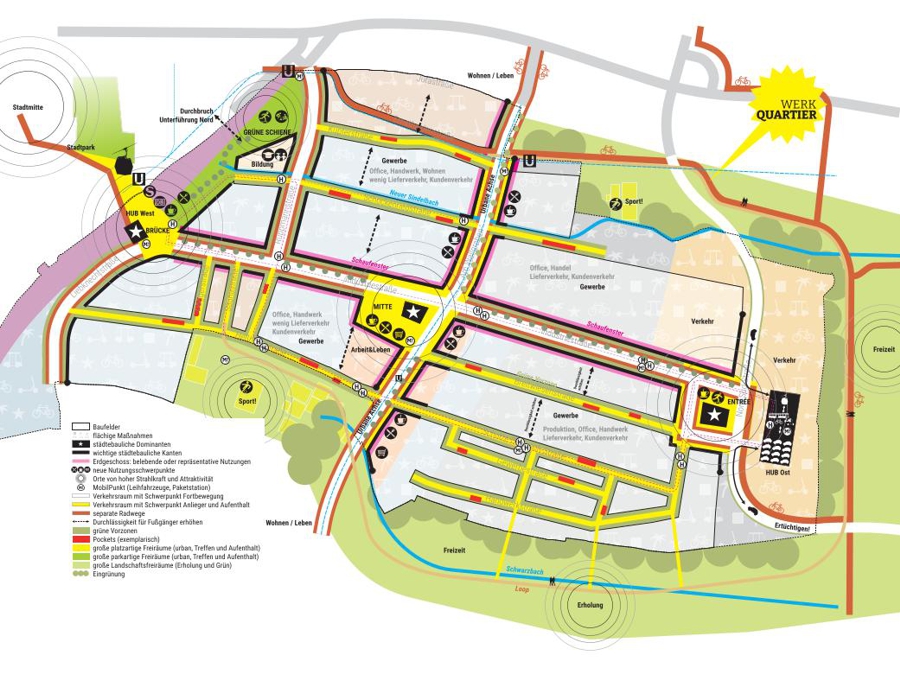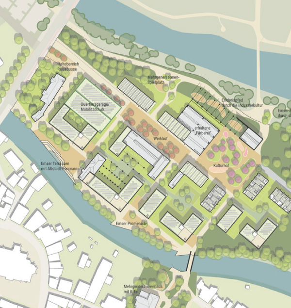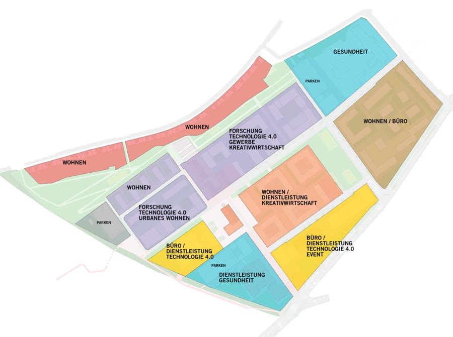 Im Zuge der Neuentwicklung des Areals kommt insbesondere dem Umgang mit dem Bestand und der Ablesbarkeit des industriellen Erbes große Bedeutung zu. Dies umfasst zum einen den Erhalt prägender und wertvoller Bauten sowie deren Um- und Neunutzung. Zum anderen auch den Erhalt der räumlichen Grundkonfiguration des Areals und seiner „Richtungen“. Im Rahmen der Ausbildung von Baufeldern steht auch die Auseinandersetzung mit dem öffentlichen Raum, mit der Schaffung qualitätvoller Freiräume und Platzflächen sowie attraktiv gestalteter Uferzonen im Fokus. Die Einbindung des neuen Quartiers in seine naturräumliche Umgebung sowie die enge Vernetzung von Frei- und Siedlungsräumen sind zentrale Aufgaben. Ebenso die Integration zu erhaltenden Bestands in die neue Bau- und Nutzungsstruktur.