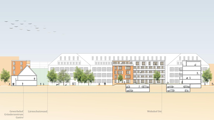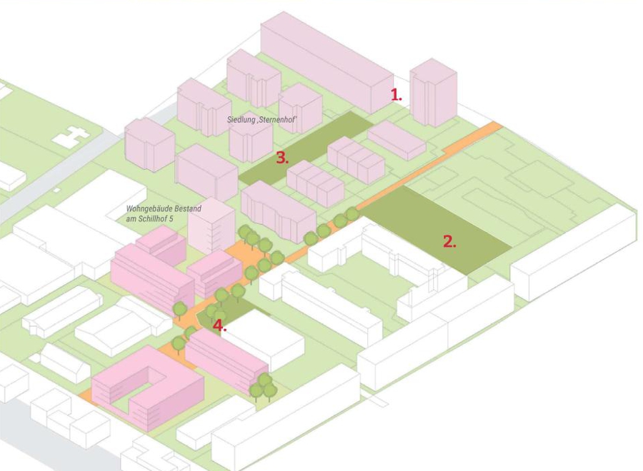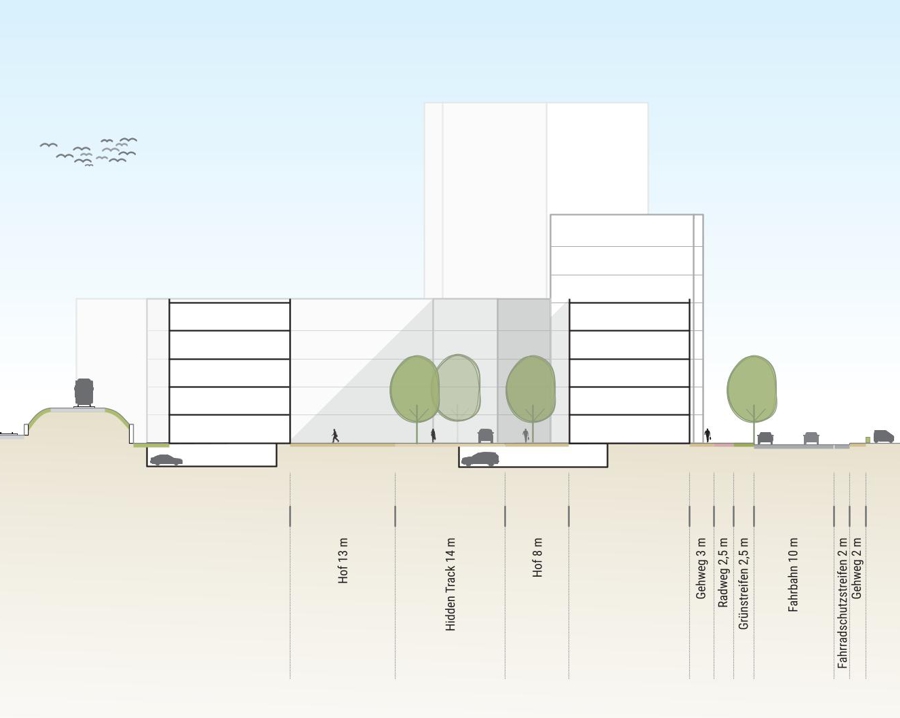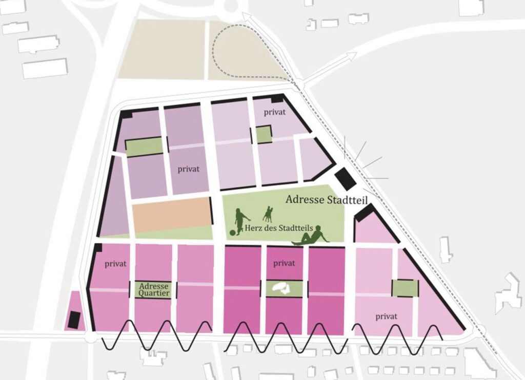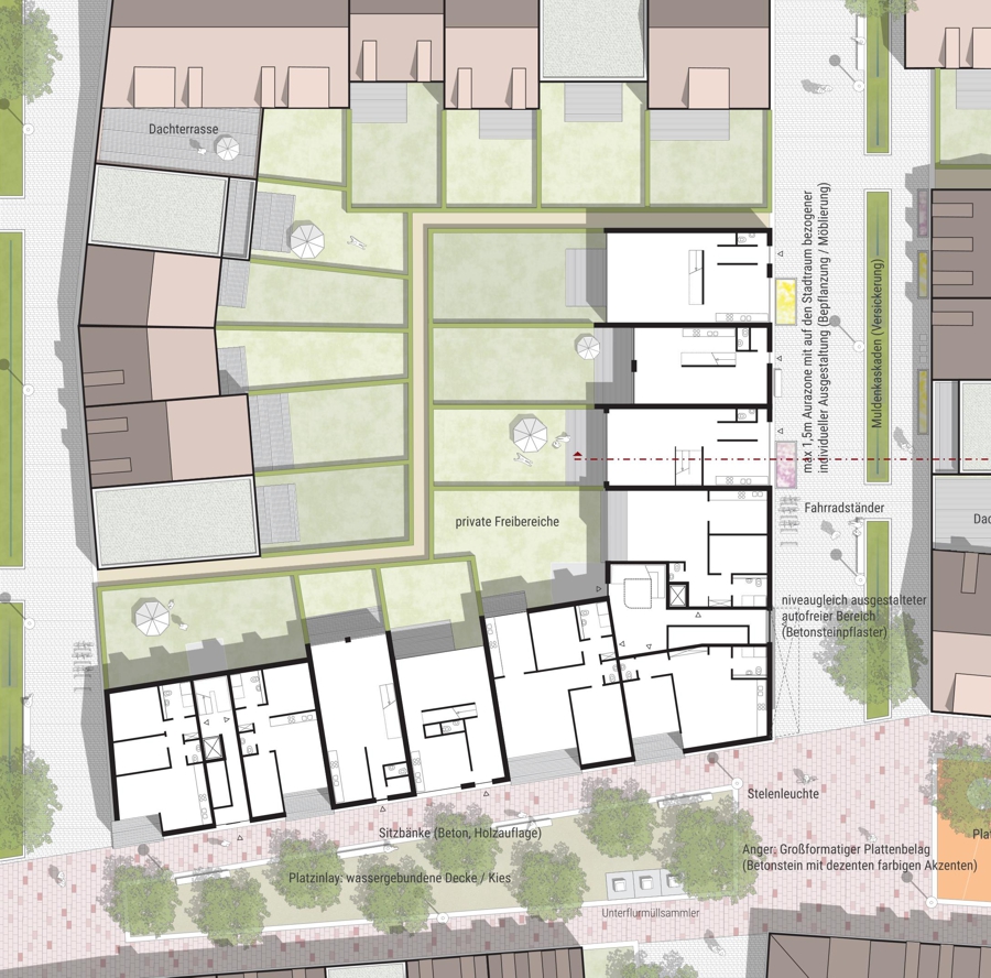 In kleinteiligem Mix aus Einfamilienwohnen in Stadthäusern und Mehrfamilienwohnhäusern sowie moderaten Gebäudehöhen von zwei bis drei Geschossen werden mehrere Wohnhöfe herausgebildet. Zusammengebunden werden diese Höfe durch die bereits erläuterte Durchwegung, die sich an einem Quartiersplatz und an einem Spielplatz aufweitet. Zusammen mit diesem „Anger“ bilden die „Gassen“ zwischen den Wohnhöfen eine nahezu dörfliche Struktur aus.