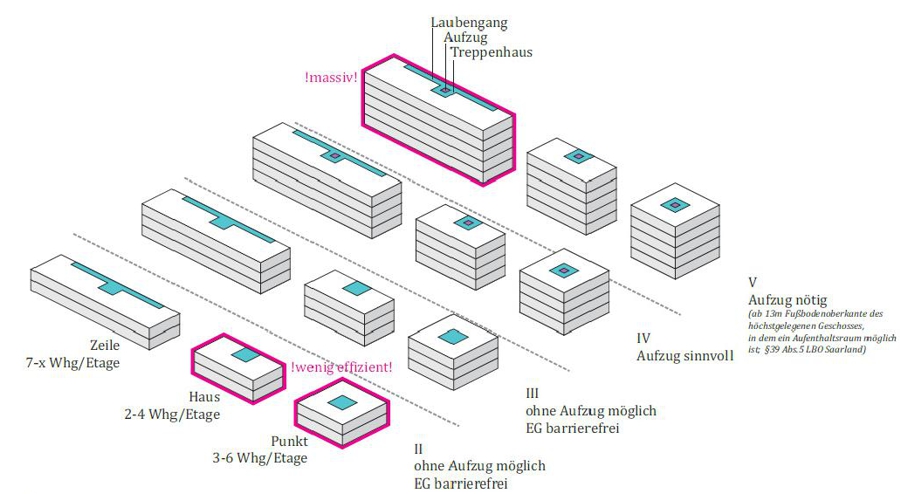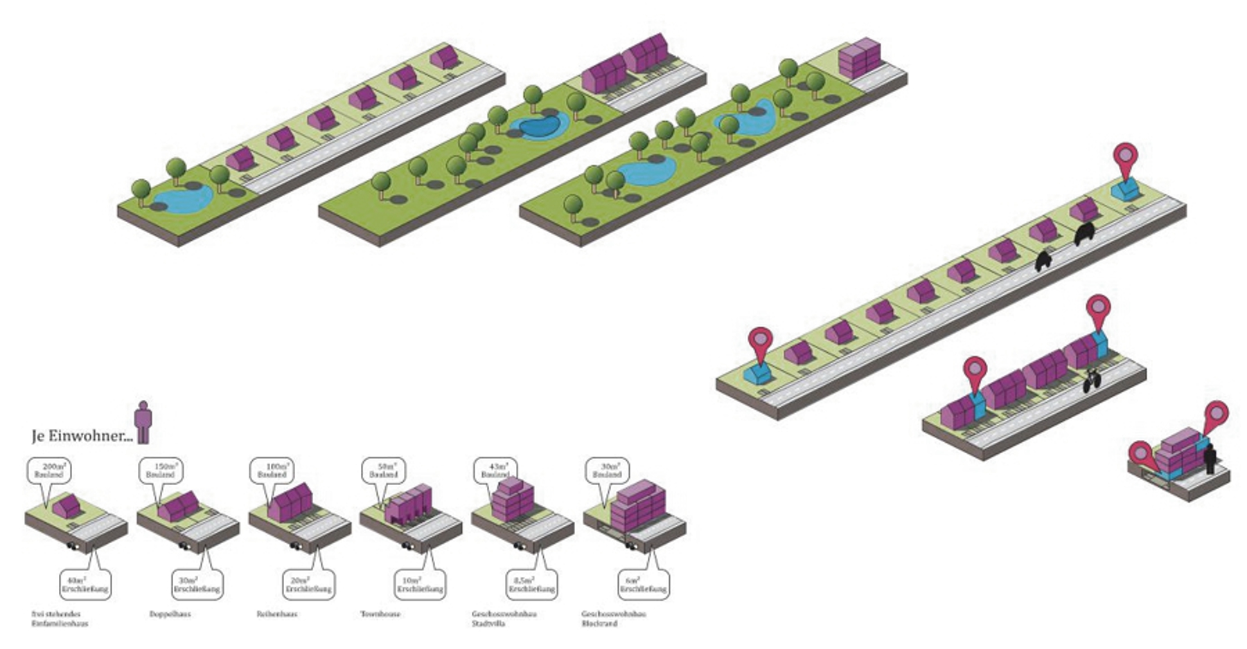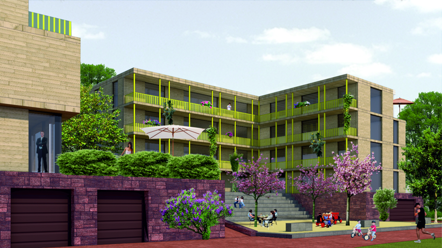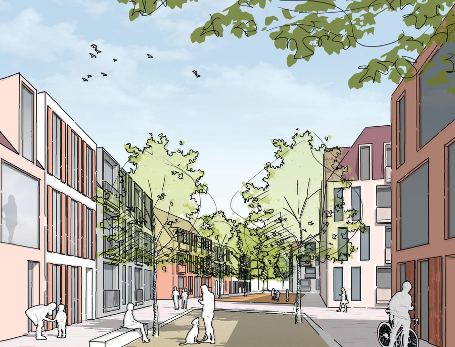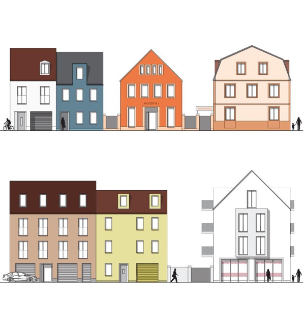 In kleinteiligem Mix aus Einfamilienwohnen in Stadthäusern und Mehrfamilienwohnhäusern sowie moderaten Gebäudehöhen von zwei bis drei Geschossen werden mehrere Wohnhöfe herausgebildet. Zusammengebunden werden diese Höfe durch die bereits erläuterte Durchwegung, die sich an einem Quartiersplatz und an einem Spielplatz aufweitet. Zusammen mit diesem „Anger“ bilden die „Gassen“ zwischen den Wohnhöfen eine nahezu dörfliche Struktur aus.