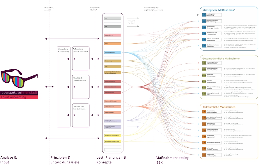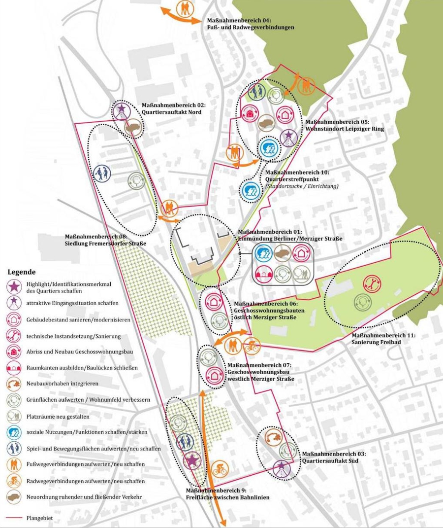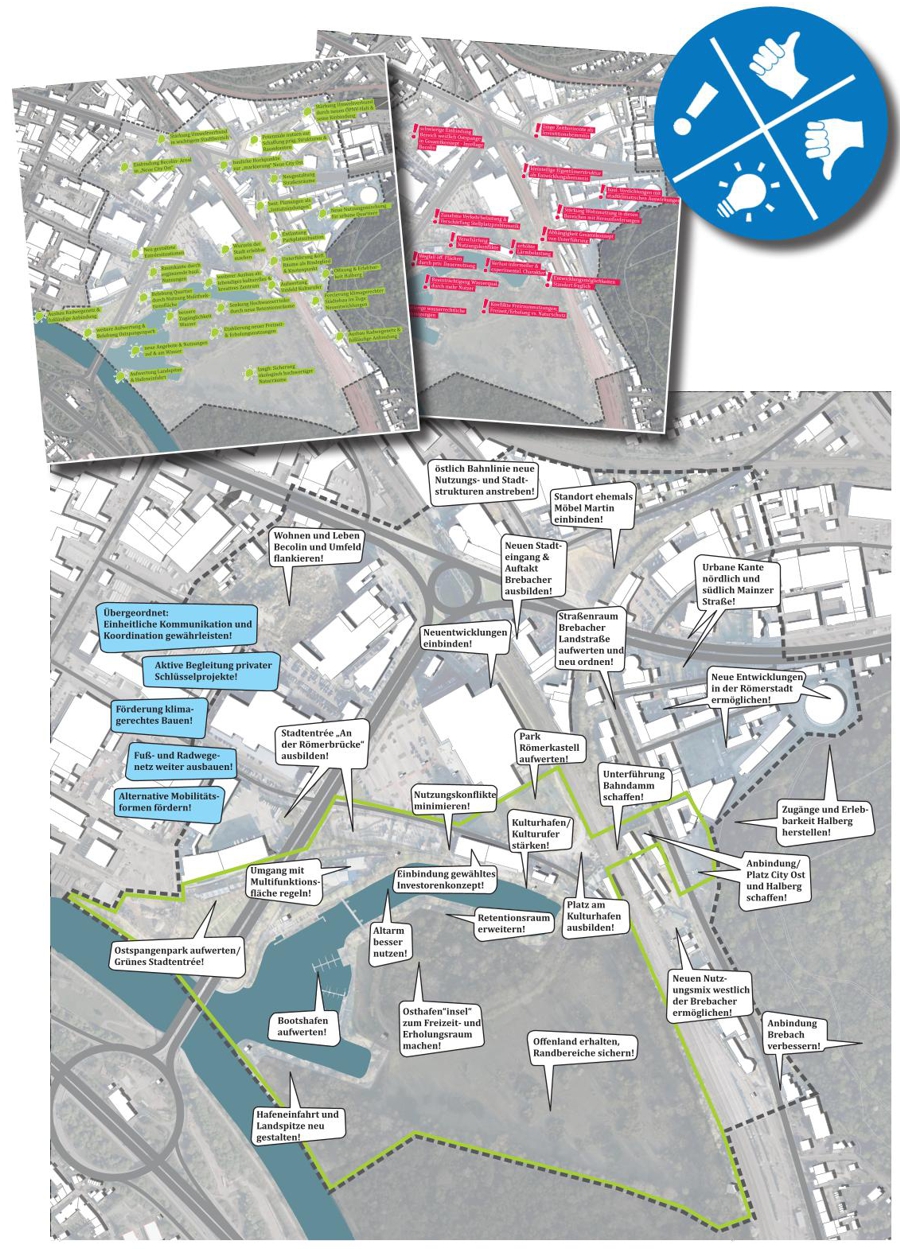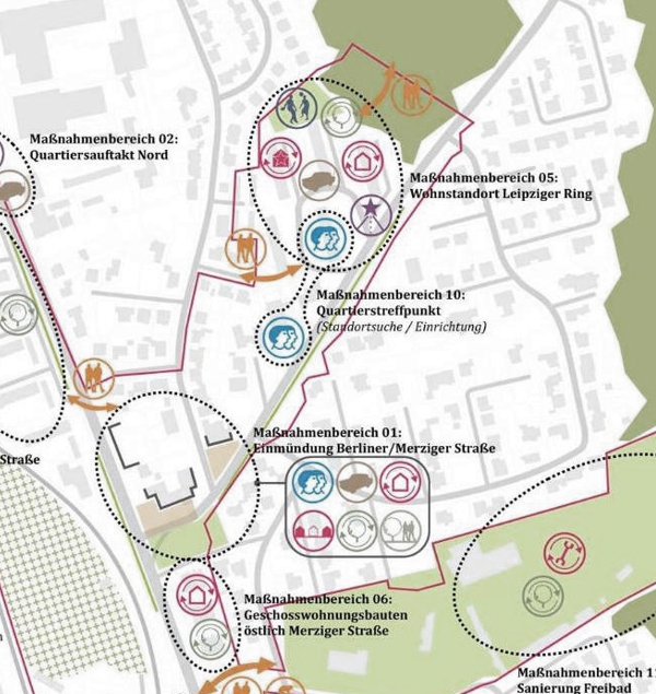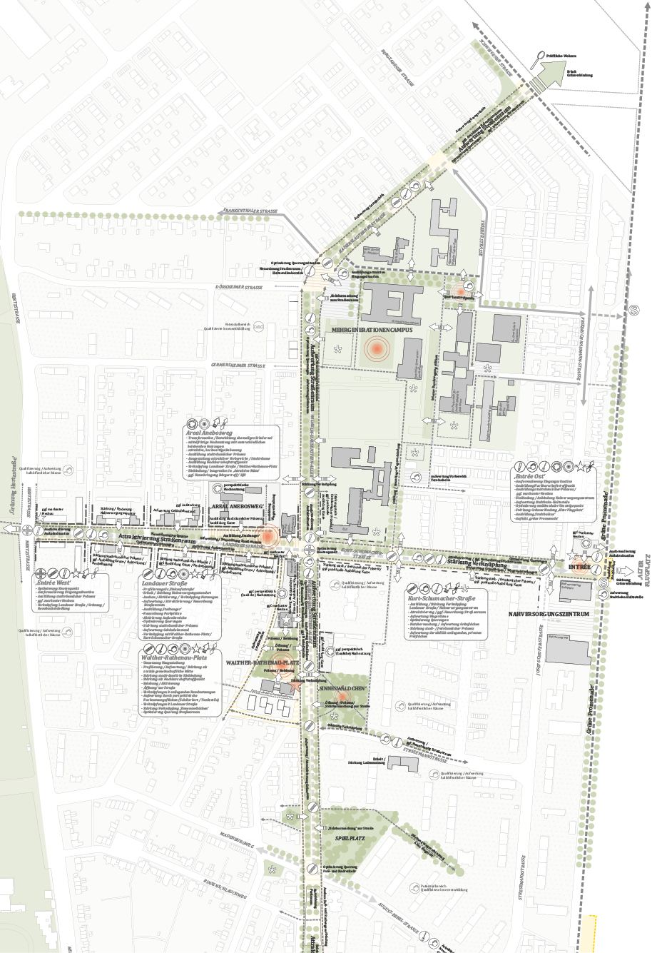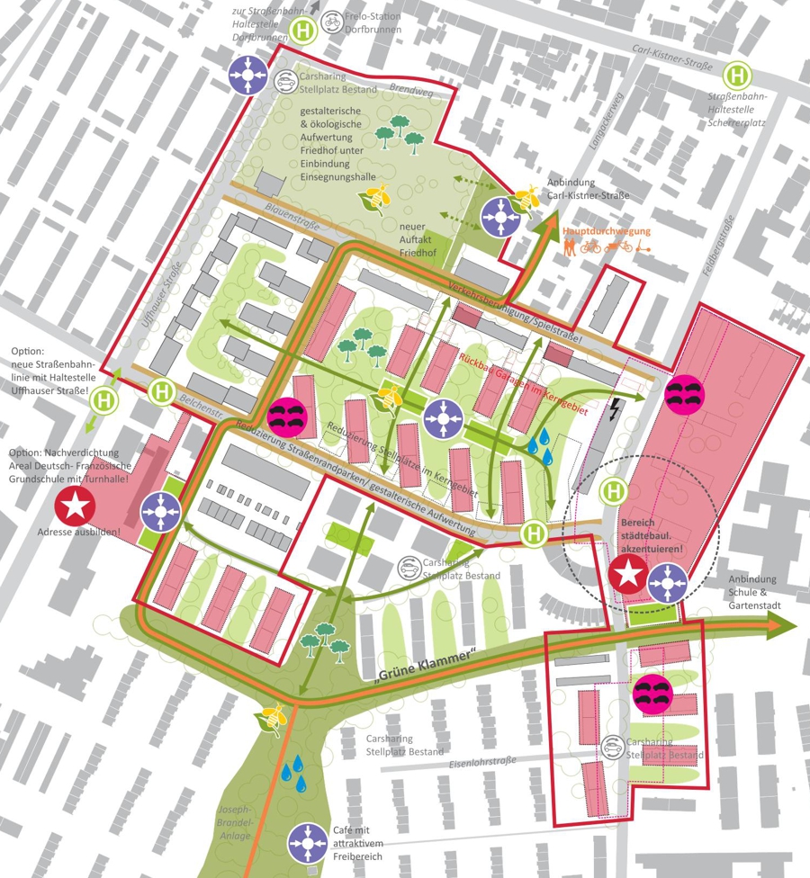 Der Prozess der Konzeptentwicklung beinhaltete eine umfassende Analyse und zahlreiche Beteiligungsformate, darunter Dialogveranstaltungen, Stadtspaziergänge und Expertengespräche. Diese intensiven Bürgerbeteiligungen und die Integration bestehender Planungen und Konzepte gewährleisteten, dass die Bedürfnisse der Bewohner und Akteure in die Planung einflossen. Auf dieser Grundlage wurden spezifische Prinzipien und Entwicklungsziele abgeleitet.