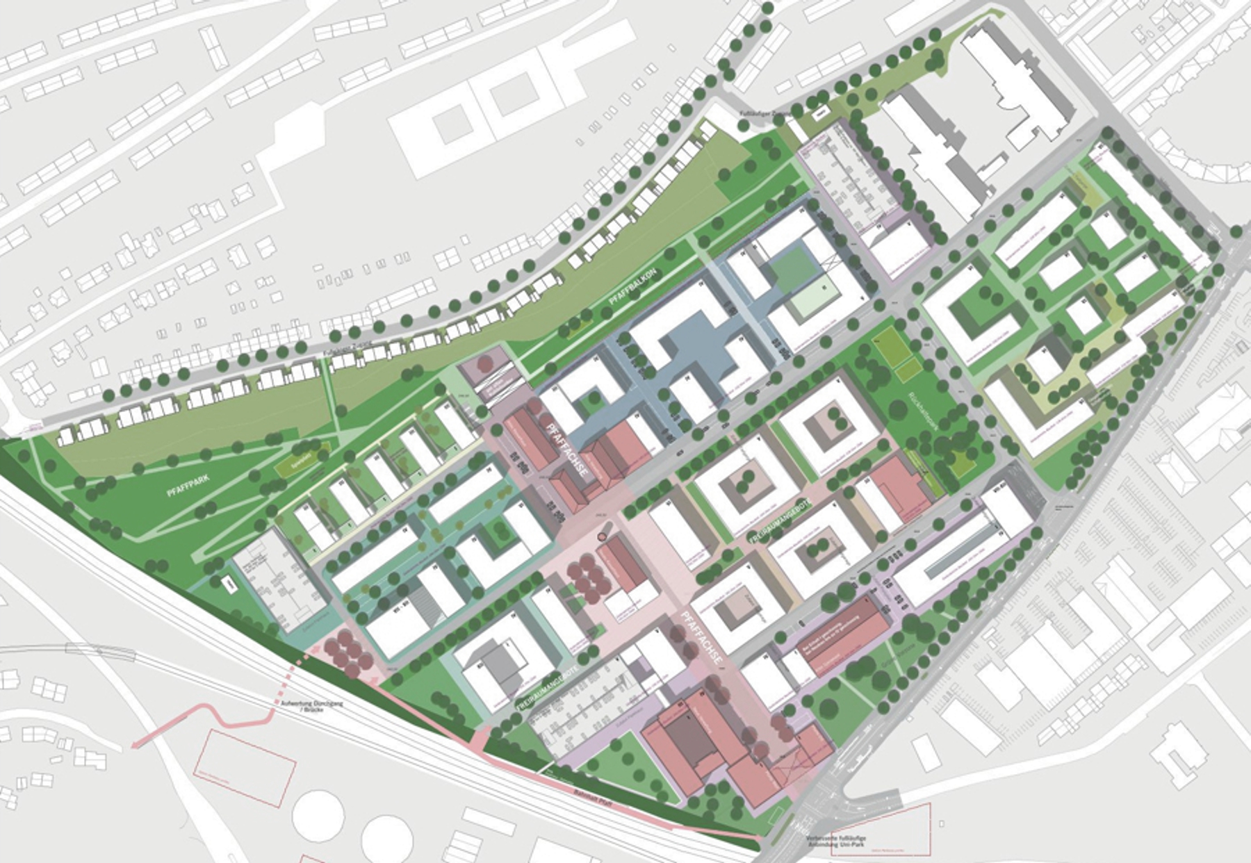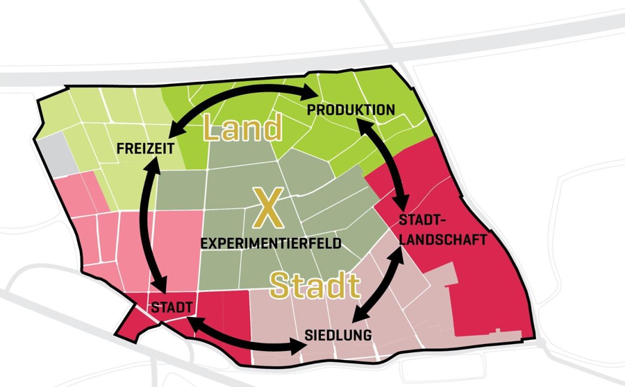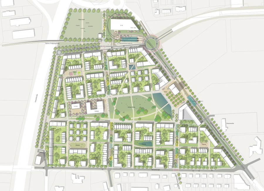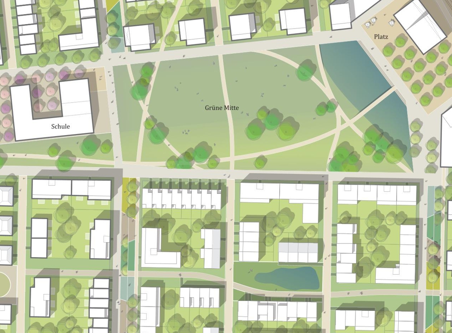 Der Rahmenplan sieht vor, dass sich die einzelnen Baugebiete, die zu etwa einem Drittel bereits realisiert sind, in Form von Schollen um den Park gruppieren. Jede Scholle ist durch eine Ringerschließung verkehrlich angebunden und wird durch kleine Platzbereiche sowie Grünzüge charakterisiert. Diese Grünfinger trennen die Quartiere voneinander, vernetzen sie aber zugleich durch ein gut ausgebautes Wegenetz und sorgen für eine klare Strukturierung des Areals. Zugleich ermöglichen diese Elemente eine flexible Anpassung an unterschiedliche städtebauliche und demografische Anforderungen.