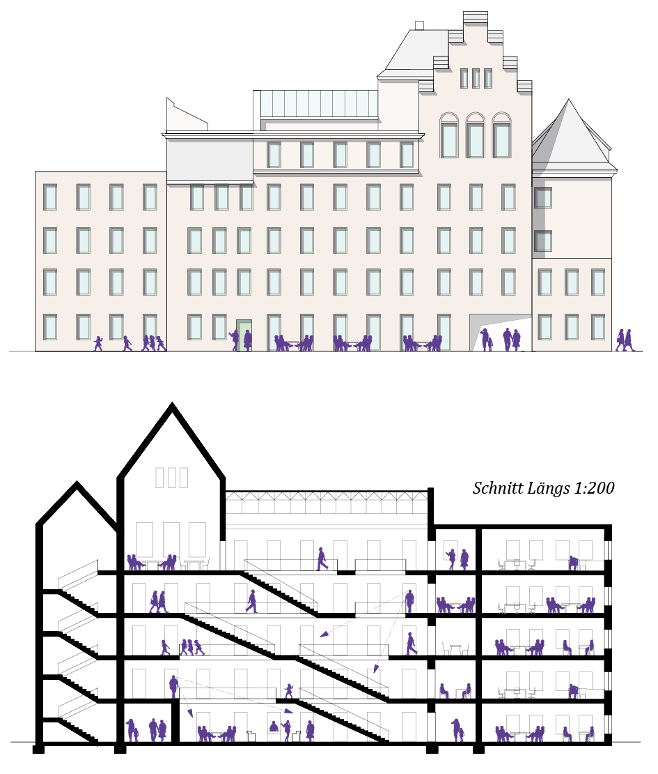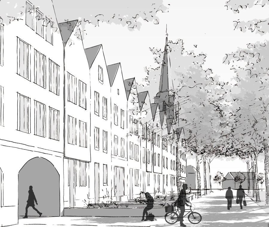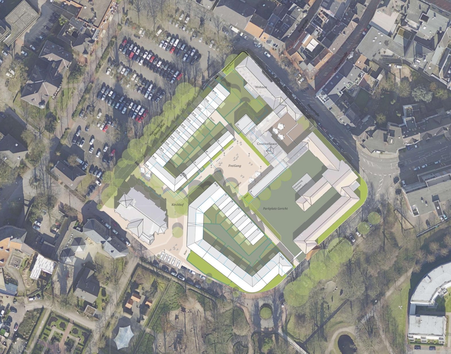 Die Vorgehensweise bestand darin, die vorhandenen städtebaulichen Gegebenheiten sorgfältig zu analysieren und das Plangebiet so zu gestalten, dass es sich sowohl nach außen öffnet als auch seine historische Struktur bewahrt. Besonders hervorzuheben war die Neugestaltung der Baufelder der evangelischen Kirche und des Arbeitsamtes sowie die Umnutzung des historischen Ensembles aus Tersteegen-Haus und Hafthaus. Die Herausforderung bestand darin, diese unterschiedlichen Strukturen miteinander in Einklang zu bringen und eine harmonische Weiterentwicklung zu ermöglichen.