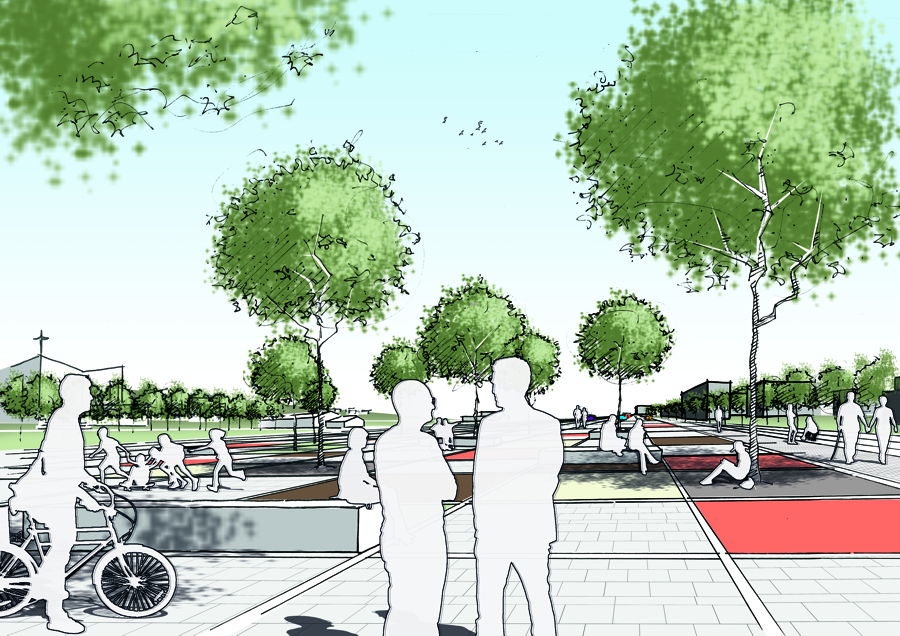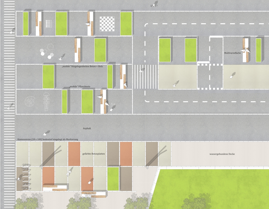 Eine wesentliche Funktion bei der Verknüpfung der Teppiche kommt einer von Südost nach Nordwest verlaufenden Durchwegung für Fußgänger_innen und Radfahrende zu. Diese Durchwegung durchläuft alle ausgerollten Teppiche und bildet der jeweiligen Nutzung entsprechende Platz- und Freiräume aus, die als Trittsteine in dieser neuen, qualitätsvollen Stadtstruktur dienen.