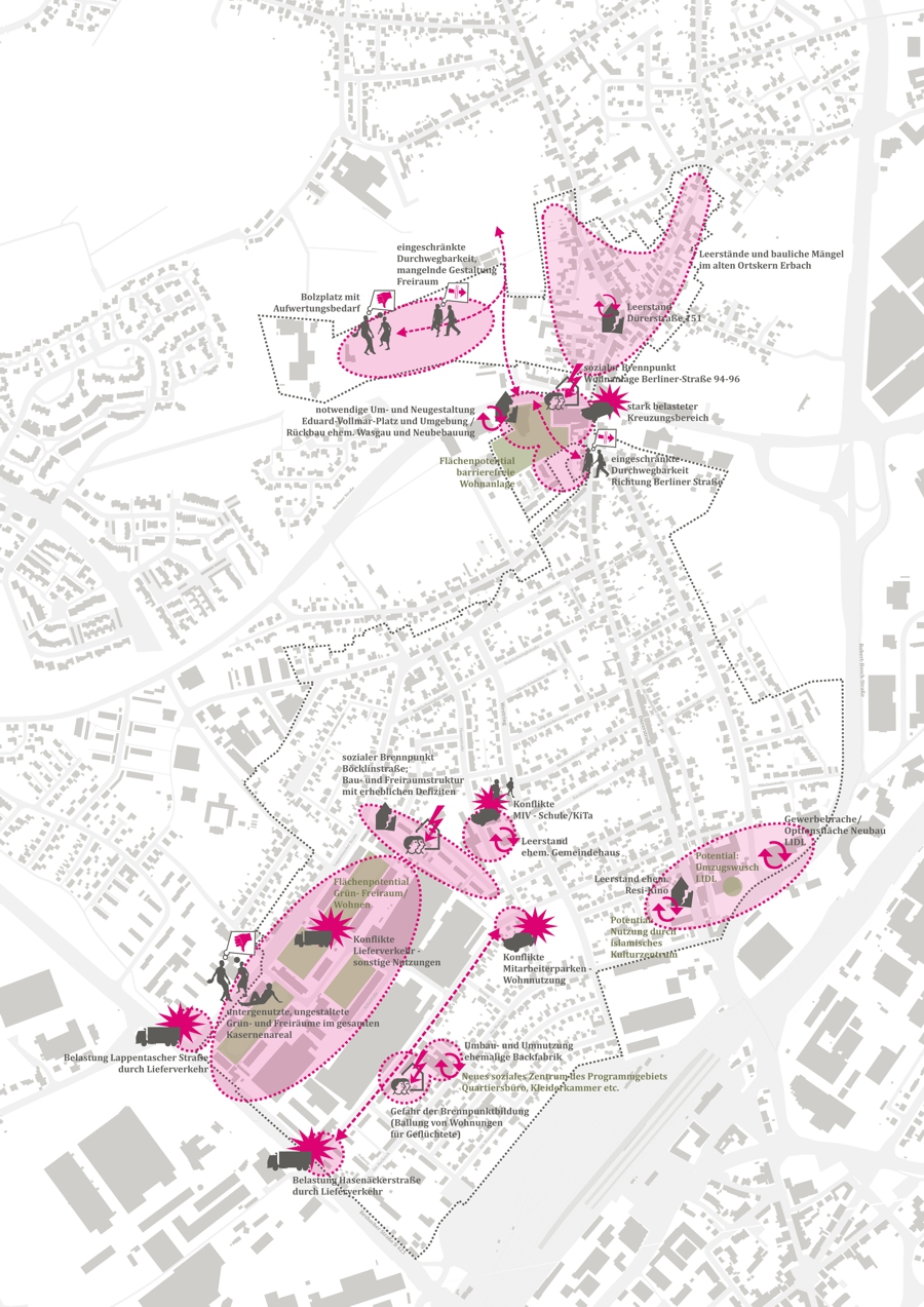 Die Vorgehensweise bestand in einer vertiefenden Analyse und Herausarbeitung der bestehenden Schwächen, Problemfeldern und Potenzialen im „Soziale Stadt“-Gebiet. Dabei zeigte sich, dass besonders die sozial benachteiligten Bereiche unter Mängeln im Wohnumfeld und Umweltbelastungen, wie Verkehrslärm, litten. Dies verstärkte die soziale Segregation und führte zu einer Abwärtsspirale im Gebiet. Die Fortschreibung zielte darauf ab, die Grundlage für die Festlegung eines Sanierungsgebiets zu schaffen und eine integrierte Herangehensweise zur Lösung dieser Problemlagen zu entwickeln.