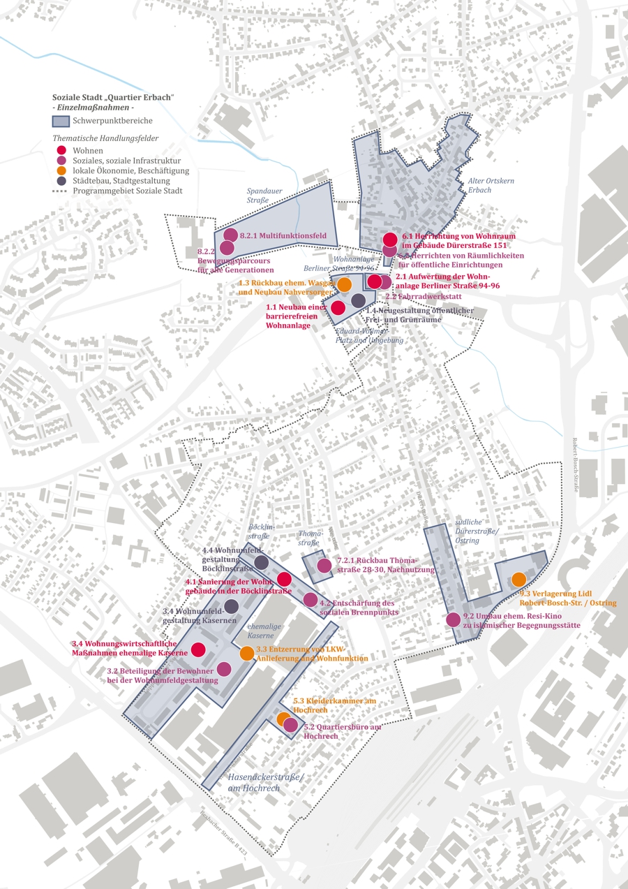 Im Stadtteil Erbach der Kreisstadt Homburg wurde das Fördergebiet „Quartier Erbach“ im Rahmen des Städtebauförderprogramms „Soziale Stadt“ definiert, um gezielt städtebauliche und soziale Herausforderungen anzugehen. Das Ziel der Fortschreibung des integrierten städtebaulichen Entwicklungskonzepts (ISEK) von 2017 war es, durch die Identifikation von Sanierungsbedarfen Anreize zur Modernisierung und Sanierung von privatem Wohnraum zu schaffen. Insbesondere sollte das Sanierungsrecht als wirksames Instrument zur Aufwertung der überwiegend privaten Wohnbausubstanz im Gebiet genutzt werden, um die Lebensqualität zu verbessern und soziale Segregation zu verringern.