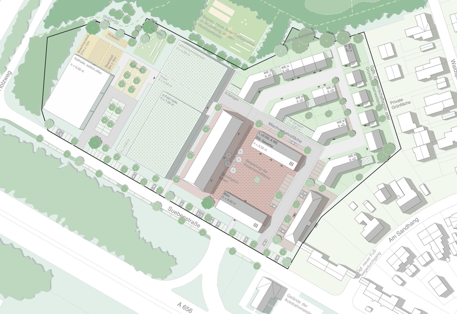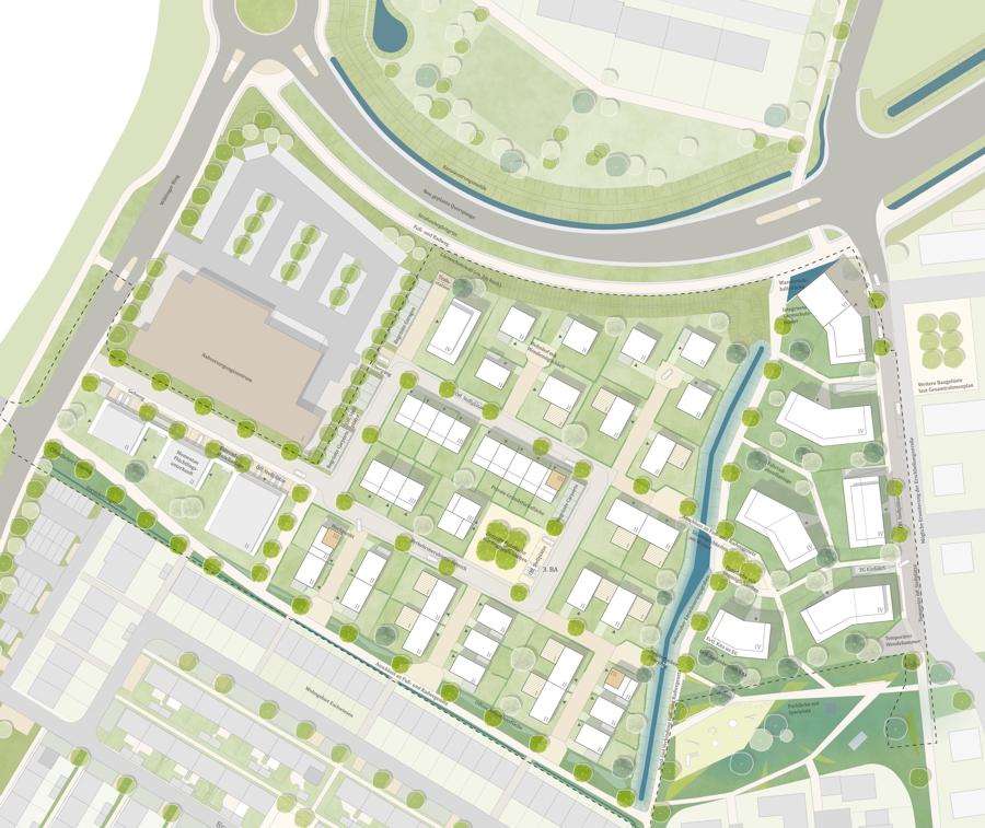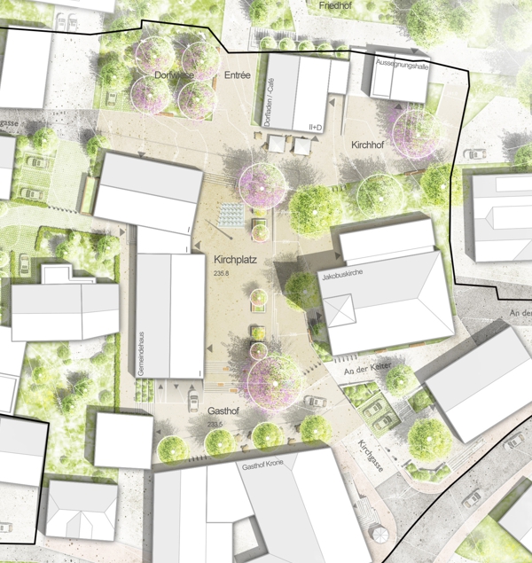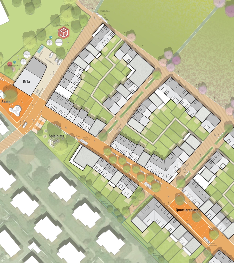 Die neuen Geschosswohnungsbauten rahmen den Dorfplatz und schaffen einen einladenden Eingang ins Neubaugebiet. Mit Erdgeschossnutzungen wie Gastronomie oder Begegnungsräumen wird der Platz belebt. Gestaltelemente wie Wasserspiele, Sitzmöglichkeiten, Baumreihen und Grünflächen verleihen dem Dorfplatz hohe Aufenthaltsqualität. Eine angrenzende Spielfläche und ein Kindergarten fördern zusätzlich die Attraktivität und schaffen einen lebendigen Treffpunkt im Herzen des neuen Baugebiets.
