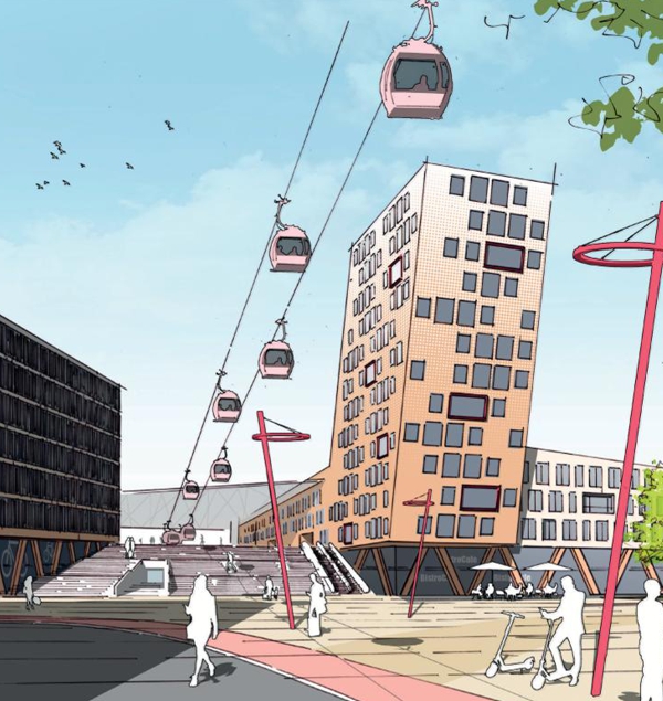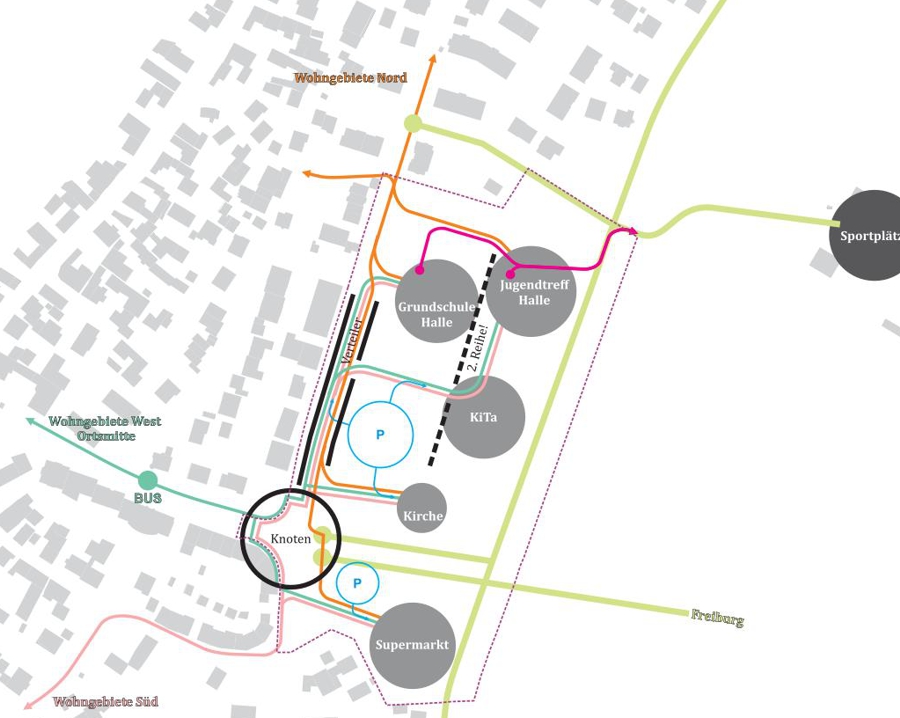 Der Entwurf geht von einer Entkopplung von Wohnen und Parken aus, um Platz für eine hohe Typologienvielfalt und einen niedrigen Flächenverbrauch zu schaffen. Das Parken wird in einem flexiblen, effizienten Parkhaus organisiert, das auf den Bedarf einer zukünftigen, weniger auf den PKW fokussierten Mobilität abgestimmt ist. Ergänzt wird das Konzept durch autonome Rufbusse, die die Quartiere miteinander verbinden und so eine komfortable und zukunftsorientierte Mobilität ermöglichen.