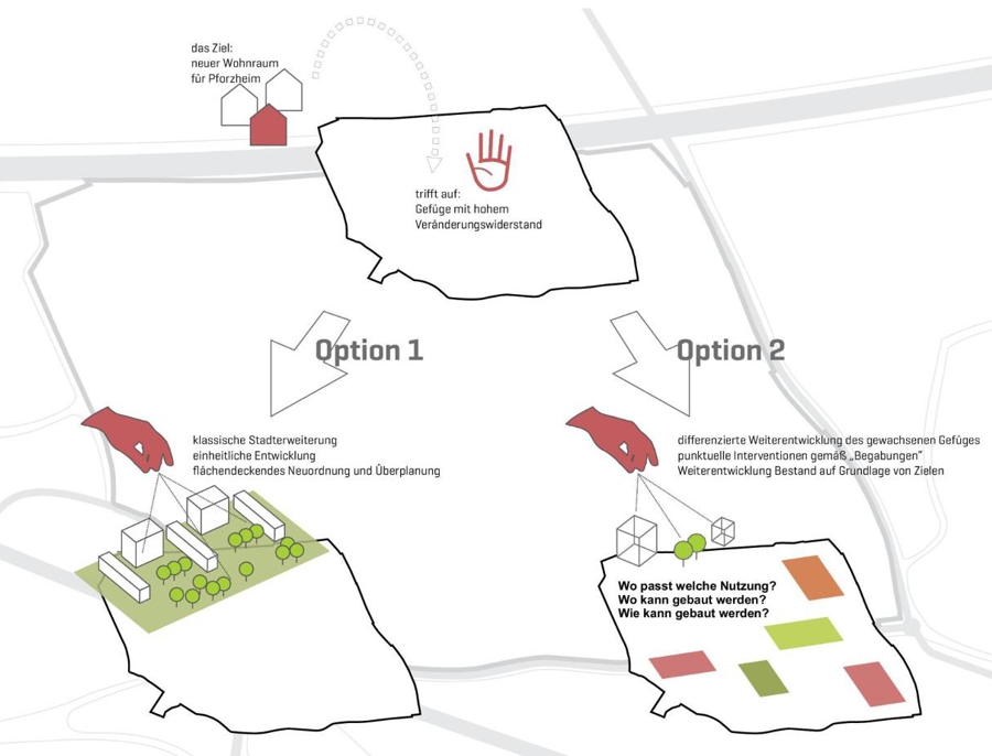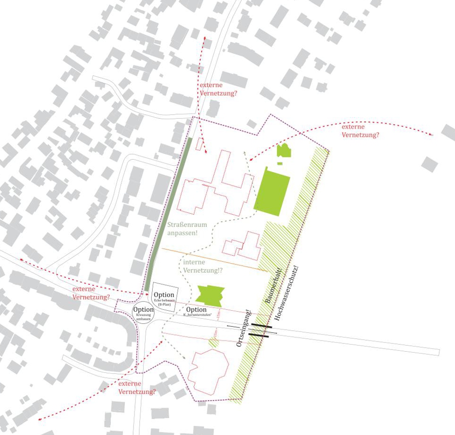 In einem mehrstufigen Prozess wurde die bestehende Siedlungsstruktur analysiert, um mögliche Entwicklungsszenarien zu erarbeiten. Dabei wurden städtebauliche Elemente wie die kleinteilige Haus-Hof-Bebauung und grüne Innenbereiche berücksichtigt. Der Neubau eines Lidl-Marktes wurde als isolierter Fremdkörper erkannt und es wurde ein Entwurf entwickelt, der die Siedlungskante unter Beibehaltung eines grünen Innenbereichs fortführt. Gleichzeitig wurde die Notwendigkeit einer Anpassung an heutige Nutzungsansprüche berücksichtigt, was den Einsatz von Geschosswohnungsbau erforderte.