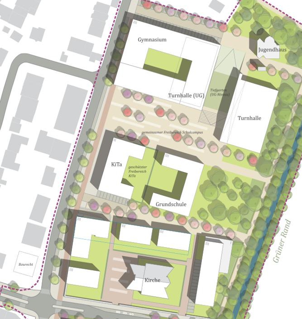 Das ca. 4 ha große Plangebiet in Opfingen, gelegen westlich von Freiburg, soll nachverdichtet werden. Hierbei soll das zentrale Kirchengebäude, die St. Nikolaus Kirche, erhalten bleiben. Ziel ist es, die vorhandenen Flächenpotenziale für barrierefreies Wohnen, das verschiedene Altersgruppen und Familienmodelle anspricht, sowie für soziale Einrichtungen zu nutzen. Das Bauvorhaben wird vom Gestaltungsbeirat der Stadt Freiburg als besonders bedeutend für die Ortschaft angesehen, weshalb ein übergeordnetes Masterkonzept erforderlich ist, das die Nachverdichtung in Bezug zur Umgebung und den angrenzenden Infrastruktureinrichtungen setzt.