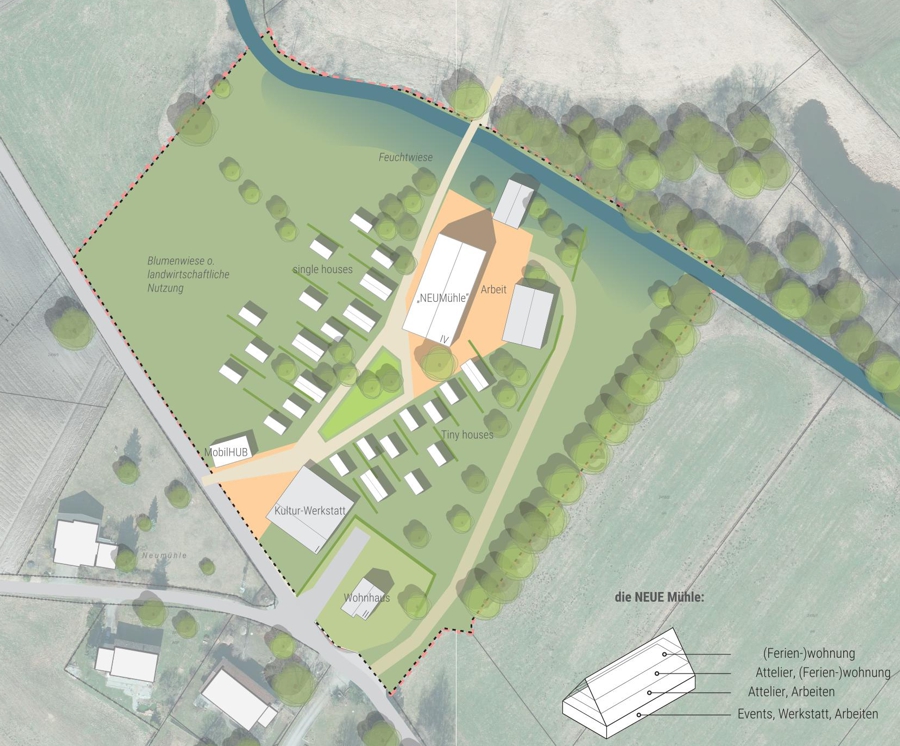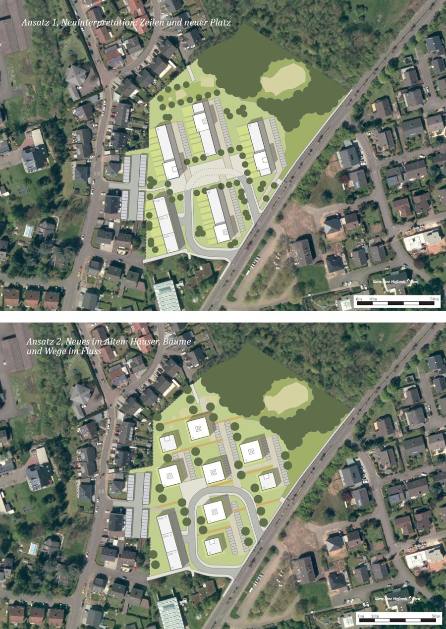 Die Entwurfsfindung erfolgt zunächst durch Testentwürfe. Hierbei verfolgt der Ansatz Teppich eine gewohnte Struktur und Typologie mit locker bebautem Hang und herkömmlichem Parken. Der Ansatz Aussiedlerhöfe kombiniert gewohnte und besondere Typologien mit verdichteter Bebauung am Hang. Beim Ansatz Baumhäuser wird eine besonders kompakte Bebauung am unteren Hang mit besonderen Typologien und Parkmöglichkeiten umgesetzt. Zum vollständigen städtebaulichen Entwurf wurde der Ansatz Aussiedlerhöfe ausgearbeitet. Dieser stellt eine gute Mischung aus effizienter Erschließung, geringer Flächeninanspruchnahme und hoher Wohnqualität dar.