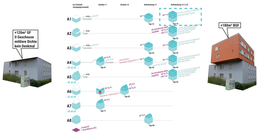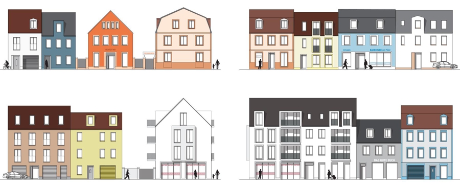 Das Ergebnis der Planung sind zwei mögliche Entwicklungsszenarien, die jeweils ein städtebauliches Gesamtbild bieten. Besagte Szenarien beinhalten sowohl eine integrierte, übergreifende Entwicklung als auch eine kleinteilige Nachverdichtung, die auf den privaten Grundstücken umsetzbar ist. Trotz unterschiedlicher Ansätze bleibt das grundlegende städtebauliche Ziel in beiden Szenarien erhalten.