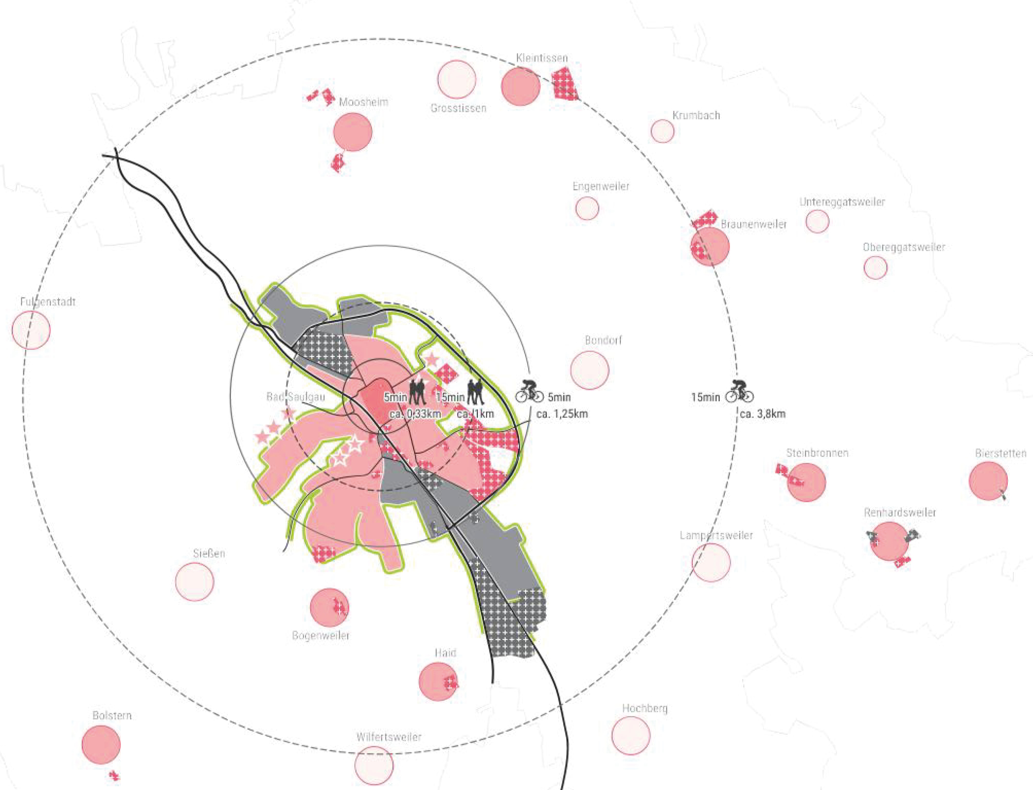 Auf diese Weise kann im Spannungsfeld bestehender Wohnsiedlungen und Schulcampus ein neues Stück Stadt entstehen, das den Wohnstandort Bad Saulgau qualitätsvoll stärkt und eine attraktive Siedlungskante in östlicher Richtung ausbildet.