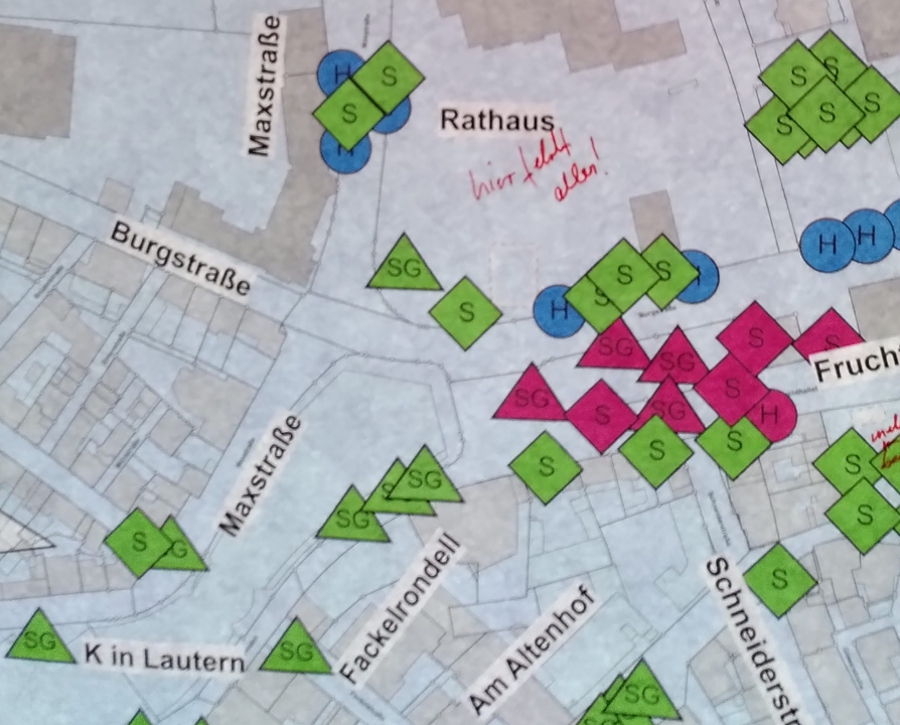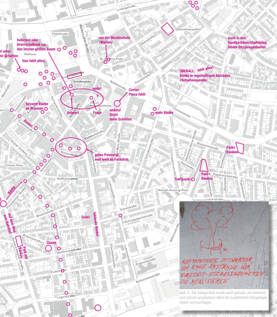 Der Workshop wurde von MESS Stadtplaner moderiert und umfasste mehrere Arbeitsphasen. Zunächst wurden die Teilnehmenden zu ihren Erwartungen befragt, anschließend erarbeiteten sie durch Klebepunkt-Votings, Kartenmarkierungen und Entwürfe konkrete Vorschläge. Besonders im Fokus standen die Achse Musikerplatz bis Mainzer Tor sowie markante Plätze wie der Stockhausplatz und der Bereich vor dem Union-Kino. Es wurde ermittelt, welche Bankmodelle bevorzugt werden, wo Sitzgelegenheiten fehlen und wie besondere Orte gestaltet werden können.