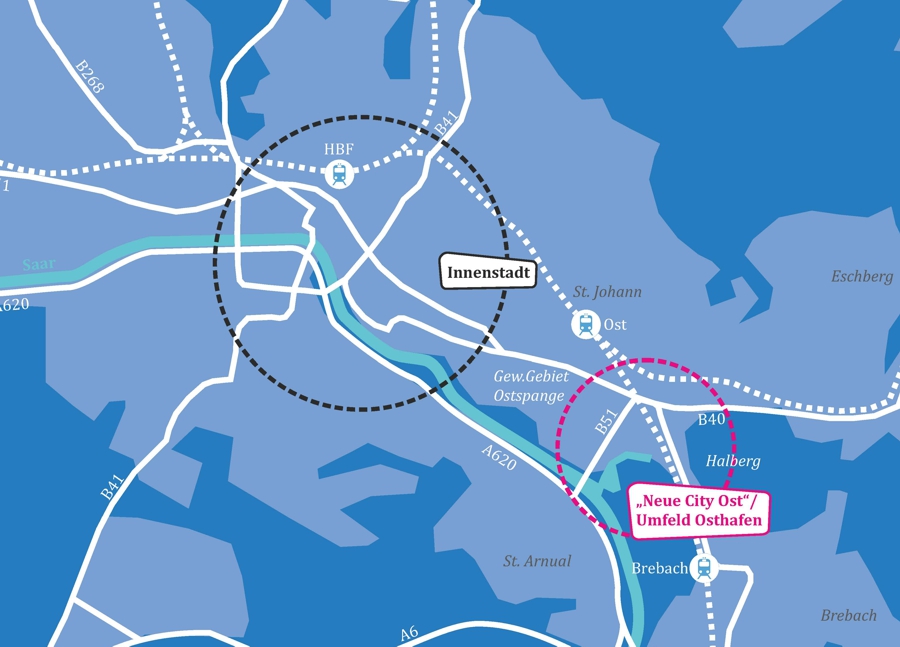 Der Saarbrücker Osthafen und seine Umgebung stellt einen Schwerpunkt der Stadtentwicklung Saarbrückens dar und soll gestärkt sowie städtebaulich qualifiziert werden. Übergeordnetes Ziel ist es, Saarbrücken als Oberzentrum in der grenzüberschreitenden europäischen Großregion zu etablieren und nachhaltige Entwicklungen voranzutreiben. Das Projekt fokussiert sich auf die Schaffung einer neuen „City Ost“, die neben wirtschaftlichen Potenzialen auch Kunst, Kultur und Lebensqualität fördert und als Naherholungsgebiet dient.
