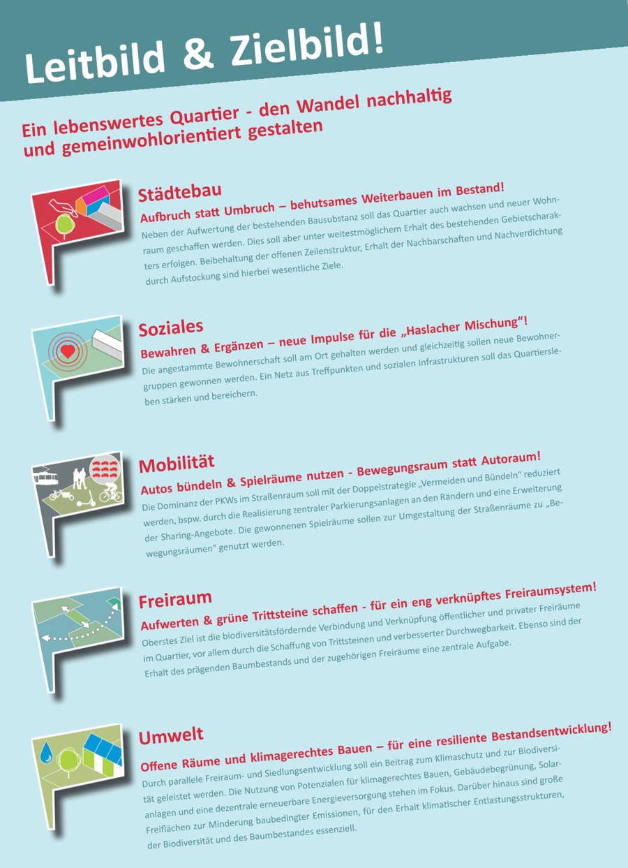 Die fertigen Leitlinien bieten eine planerische Grundlage für alle zukünftigen Entwicklungen im Quartier. Sie berücksichtigen Themen wie die bauliche Gestaltung, die soziale Infrastruktur, Mobilitätskonzepte und die Gestaltung öffentlicher Räume. Als informelles Konzept dienen sie als Orientierung für die weiteren Planungs- und Entscheidungsprozesse in Bezug auf städtebauliche Wettbewerbe und Bauleitplanverfahren.