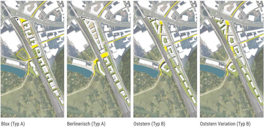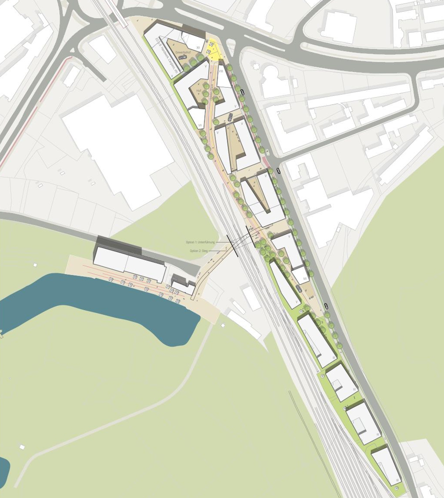 Das Projekt basiert dabei auf einer fundierten Analyse der bestehenden Strukturen und Rahmenbedingungen. Verschiedene städtebauliche Varianten, darunter Blockstrukturen, Berliner Höfe oder eine strahlenförmige Bebauung entlang des alten Gleisverlaufs, wurden erarbeitet, um die städtebaulichen Potenziale auszuloten. Die Planung legt dabei großen Wert auf Flexibilität und Anpassungsfähigkeit, um sowohl die bestehenden Eigentumsverhältnisse als auch die Interessen der betroffenen Eigentümer zu berücksichtigen.