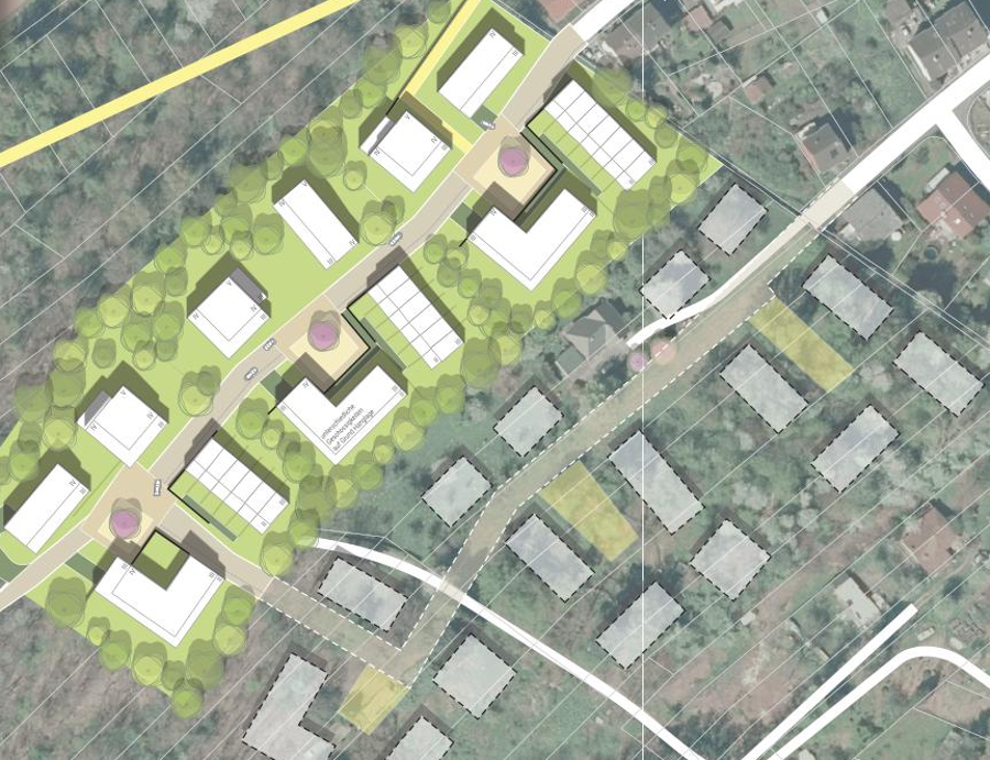 Im Rahmen des Planungsprozesses wurde ein Masterkonzept entwickelt, das die Nachverdichtung unter Berücksichtigung der städtebaulichen Anforderungen und der Realisierbarkeit der Bauvorhaben ermöglicht. Zwei Umsetzungshorizonte wurden definiert: ein kurzfristiger, der die gegenwärtigen Rahmenbedingungen berücksichtigt, sowie ein langfristiger, der mehr Flexibilität und Optionen bietet. Ein wesentlicher Bestandteil des Konzepts war die Entwicklung eines stabilen Rasters, das als Grundlage für eine flexible und einheitliche Weiterentwicklung des Ortsrandes dient.