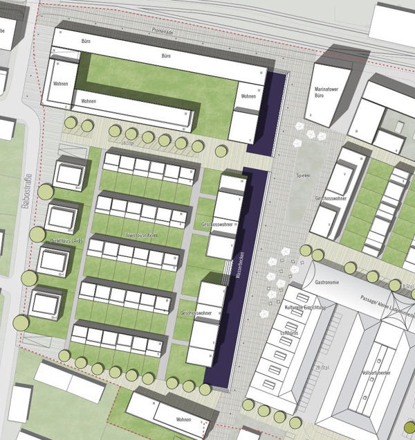 Das Ergebnis ist ein durchdachtes Konzept, das eine Vielzahl von Wohnungsbautypologien und Gewerbeflächen bietet. Die Quartiersstruktur variiert von groben Randbereichen bis hin zu feineren inneren Zonen. Privater Wohnungsbau, wie auf Townhouseparzellen oder durch Bauherrengemeinschaften, wird ebenfalls ermöglicht. Das Mobilitätskonzept fördert nachhaltige Angebote und minimiert den motorisierten Individualverkehr, während eine hohe Aufenthaltsqualität durch sorgfältig gestaltete Grünflächen und Straßenräume geschaffen wird.