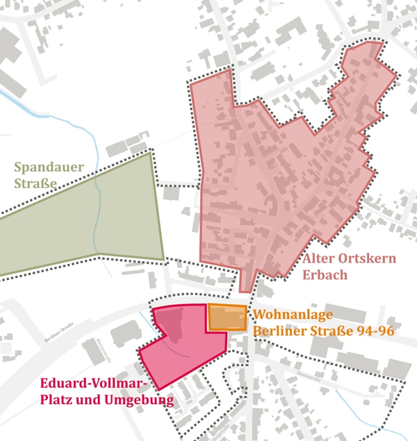 Neben der Fortschreibung des Maßnahmenkonzepts sowie der Aktualisierung bestehender Maßnahmen erfolgte im Ergebnis des Prozesses eine Erweiterung des räumlichen Umgriffs, um den Ortskern Erbach mit seiner Vielzahl an sanierungsbedürftigen Gebäude sowie sozialen und funktionalen Missständen. Es wurde ein Sanierungsgebiet abgegrenzt und eine organisatorische Begleitung durch einen Sanierungsbeauftragten vorgeschlagen. Dieser soll die Eigentümer rechtlich und gestalterisch beraten sowie Maßnahmen zur Aufwertung des Gebiets anstoßen und begleiten.