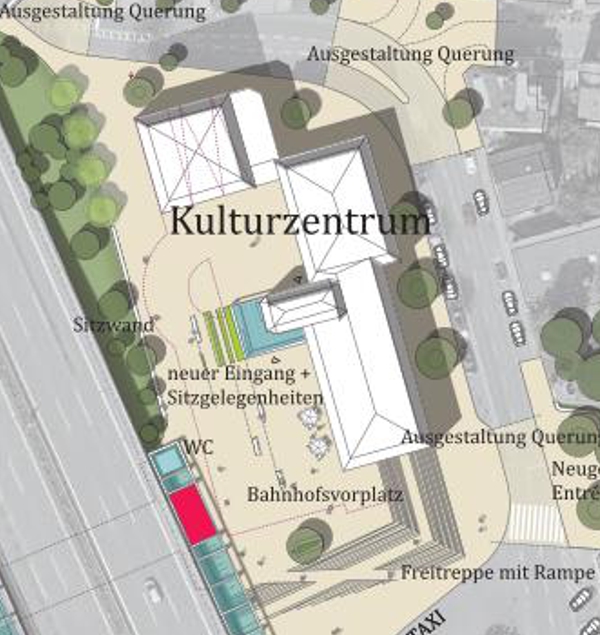 In einem ersten Schritt wird ein Grobkonzept entwickelt, das mögliche Szenarien für die Umgestaltung aufzeigt. Das Büro MESS hat dafür zwei Varianten entworfen: Eine Minimal-Variante, die kurzfristige, kostengünstige Maßnahmen umfasst, und eine Maximal-Variante, die langfristige und umfassendere Änderungen vorstellt. Dabei werden verschiedene funktionale und gestalterische Elemente berücksichtigt, wie etwa die Einrichtung von neuen Zugängen, Fahrradabstellmöglichkeiten und eine Aufwertung des gesamten Platzbereichs mit Sitzgelegenheiten und Begrünungselementen.