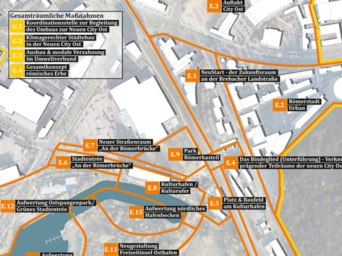 In ihrer Gesamtheit lassen sich die großen Potenziale, die einem Gesamtkonzept für das Untersuchungsgebiet Umfeld Osthafen innewohnen, unter dem Claim Neue City Ost Urbanes Leben & Wirtschaften am Osthafen zusammenführen.